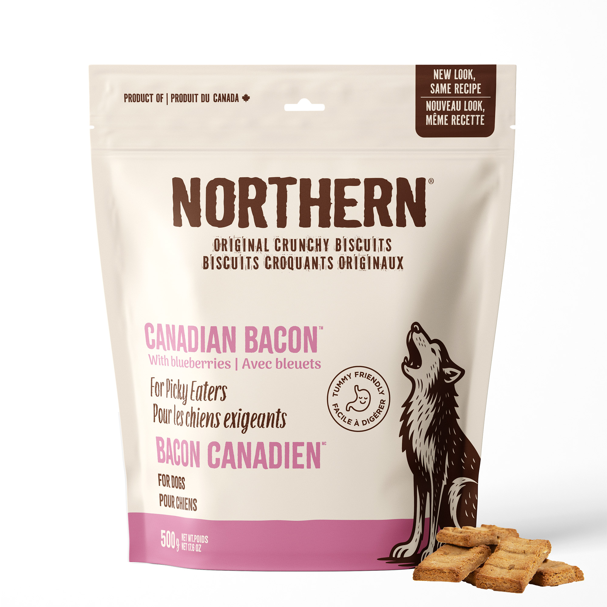 Who doesn’t like bacon and maple syrup?!? This truly Canadian recipe includes fresh, food-grade pork from Ontario and Quebec. We mix in North American whole blueberries and pure Canadian maple syrup et voila! A gift from Canada to the World! Slowly baked with whole barley and rolled oats grown and milled locally.